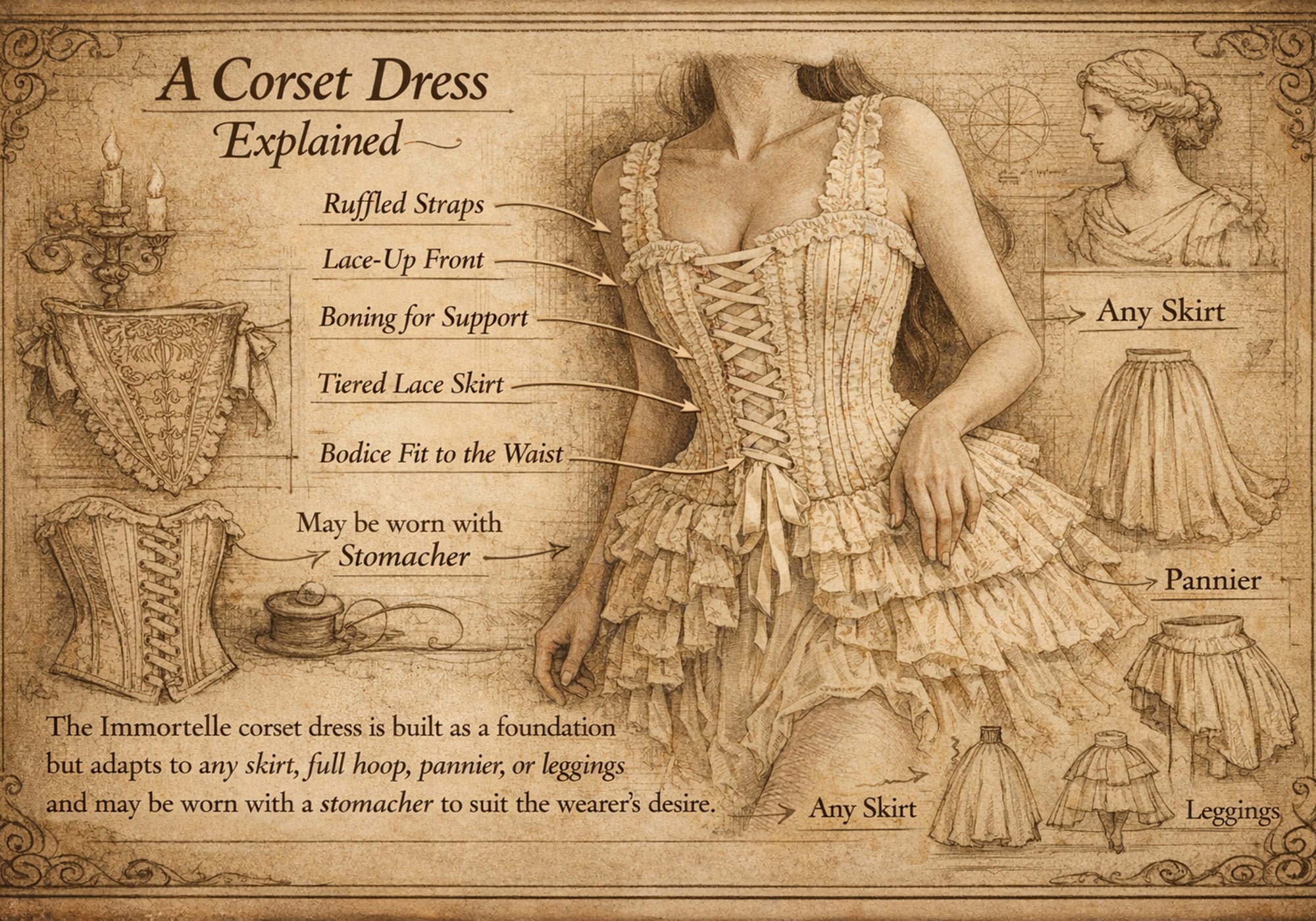 The Immortelle corset dress is designed as a framework rather than a fixed ensemble. Built with true corsetry at its core, it shapes and supports the body while remaining intentionally open to interpretation. The lace-up front allows for the use of a stomacher, transforming the surface and expression of the dress at will. Designed to be worn with any skirt, pannier, full hoop, or even styled on its own, the corset dress shifts easily between historical silhouette and modern allure. It is a garment meant to move, to change, and to be worn with intention — equally suited to the revelry of a renaissance fair, the intimacy of an evening out, or the quiet power of personal adornment.